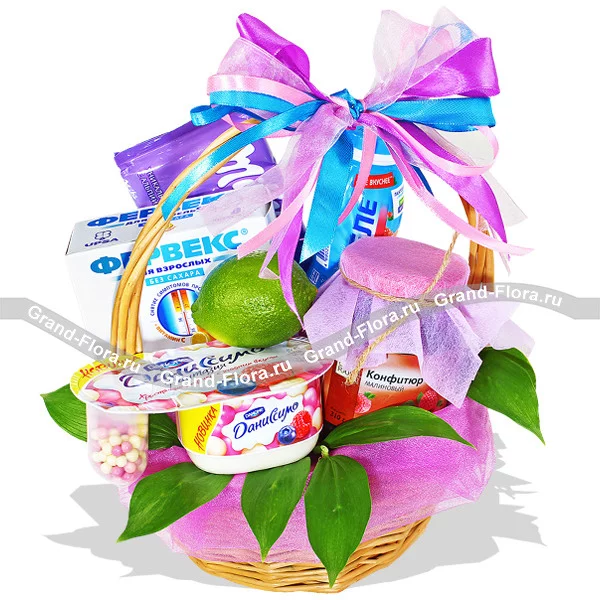 Уменьшеный: лайм - 1 шт., шоколад "Milka" - 1 шт., даниссимо - 1 шт., конфитюр - 1 шт., иммунеле - 1 шт, корзина малая, декор.