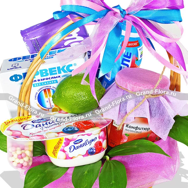 Стандартный: лайм - 1 шт., шоколад "Milka" - 1 шт., даниссимо - 1 шт., конфитюр - 1шт., Фервекс - 1 уп., корзина средняя, декор.
