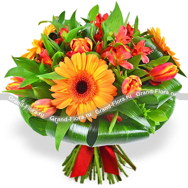 Стандартный: гербера оранжевая - 3 шт., альстромерия оранжевая - 3 шт., тюльпаны оранжевые - 5 шт., декоративная зелень, лист аспидистры - 5 шт., лента.